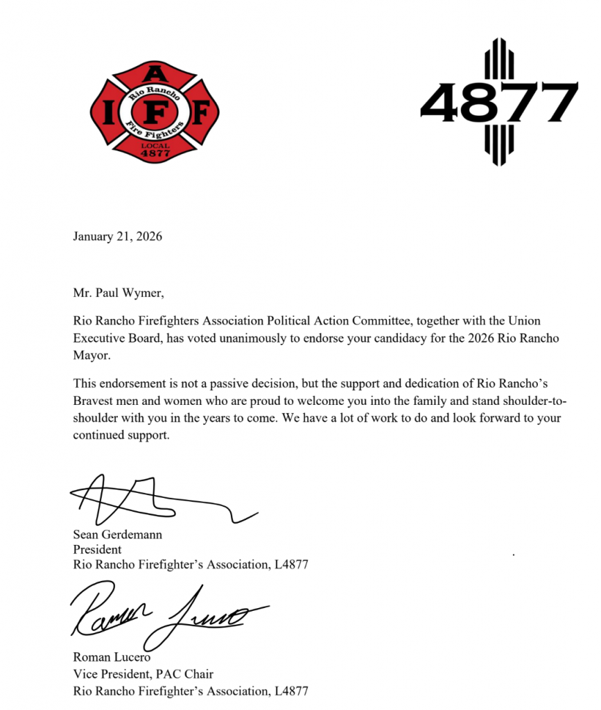 Rio Rancho Firefighters Association PAC endorses District 4 City Councilor Paul Wymer to serve as the next Mayor of Rio Rancho.